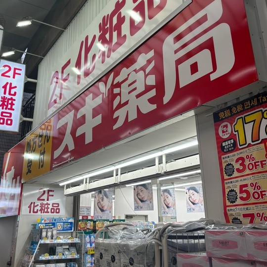 少しだけ歩くと、進行方向の左側にスギ薬局がございます。