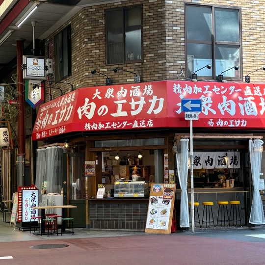 1ブロック目の右側の角に赤いテントのお店「肉のヤサカ」見えます。